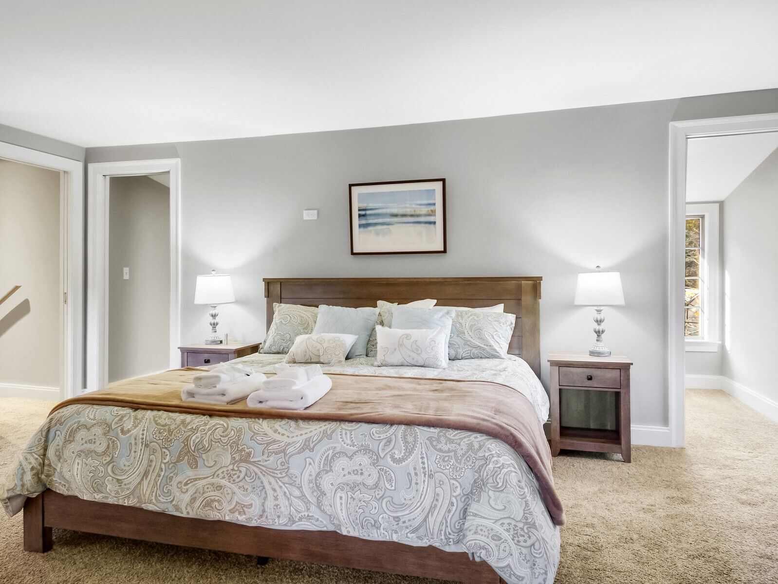 Indulge in a luxurious stay at American Eagle. Sink into the majestic king-sized sleigh bed, appreciate the elegant decor, and take advantage of the convenient amenities for a delightful coastal getaway. 2nd floor.